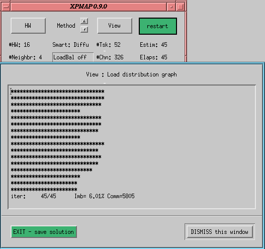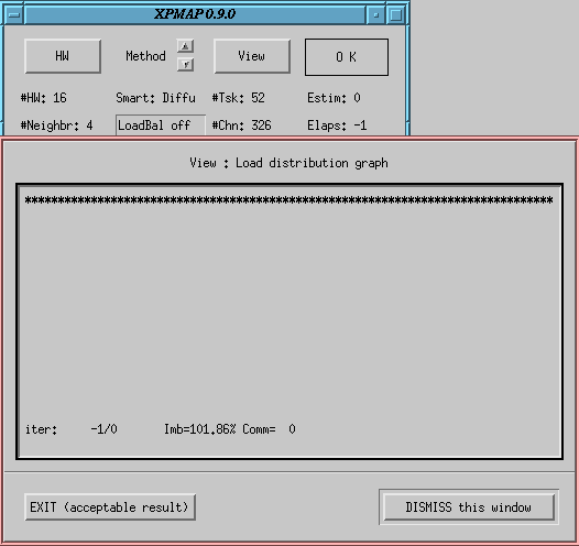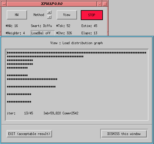 In this window in the bottom part of the text window the achieved load-balance status as "Imb" and the overall communication cost as "Comm" are shown. More detailed information about the load-imbalance is given in the top part of the text window as horizontal bars. Each this bar represents the computational load on the one processor (PVM host).